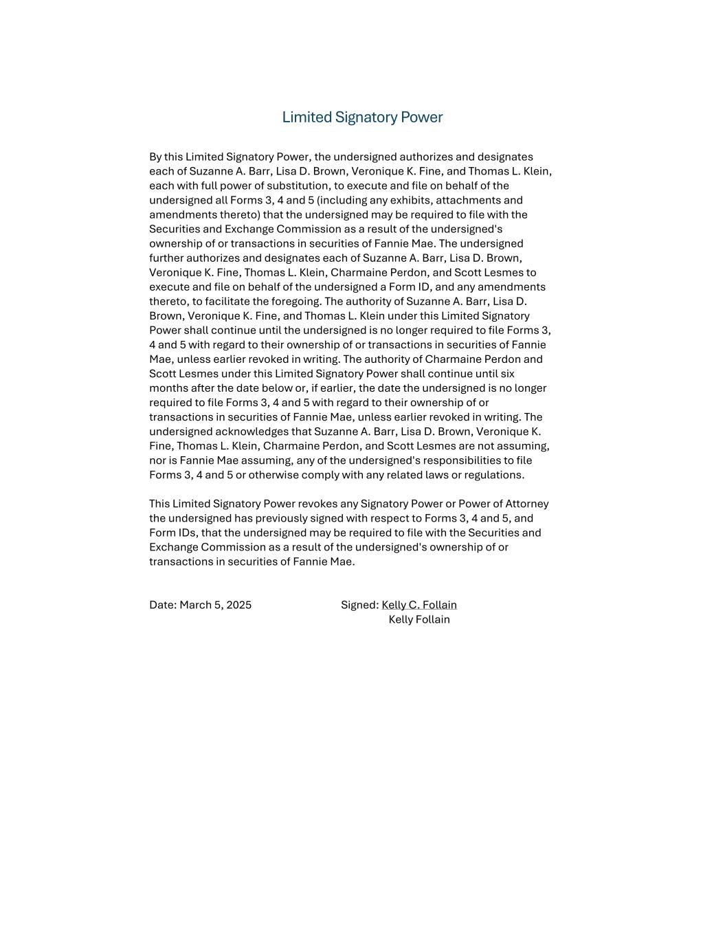 Limited Signatory Power By this Limited Signatory Power, the undersigned authorizes and designates each of Suzanne A. Barr, Lisa D. Brown, Veronique K. Fine, and Thomas L. Klein, each with full power of substitution, to execute and file on behalf of the undersigned all Forms 3, 4 and 5 (including any exhibits, attachments and amendments thereto) that the undersigned may be required to file with the Securities and Exchange Commission as a result of the undersigned's ownership of or transactions in securities of Fannie Mae. The undersigned further authorizes and designates each of Suzanne A. Barr, Lisa D. Brown, Veronique K. Fine, Thomas L. Klein, Charmaine Perdon, and Scott Lesmes to execute and file on behalf of the undersigned a Form ID, and any amendments thereto, to facilitate the foregoing. The authority of Suzanne A. Barr, Lisa D. Brown, Veronique K. Fine, and Thomas L. Klein under this Limited Signatory Power shall continue until the undersigned is no longer required to file Forms 3, 4 and 5 with regard to their ownership of or transactions in securities of Fannie Mae, unless earlier revoked in writing. The authority of Charmaine Perdon and Scott Lesmes under this Limited Signatory Power shall continue until six months after the date below or, if earlier, the date the undersigned is no longer required to file Forms 3, 4 and 5 with regard to their ownership of or transactions in securities of Fannie Mae, unless earlier revoked in writing. The undersigned acknowledges that Suzanne A. Barr, Lisa D. Brown, Veronique K. Fine, Thomas L. Klein, Charmaine Perdon, and Scott Lesmes are not assuming, nor is Fannie Mae assuming, any of the undersigned's responsibilities to file Forms 3, 4 and 5 or otherwise comply with any related laws or regulations. This Limited Signatory Power revokes any Signatory Power or Power of Attorney the undersigned has previously signed with respect to Forms 3, 4 and 5, and Form IDs, that the undersigned may be required to file with the Securities and Exchange Commission as a result of the undersigned's ownership of or transactions in securities of Fannie Mae. Date: March 5, 2025 Signed: Kelly C. Follain Kelly Follain