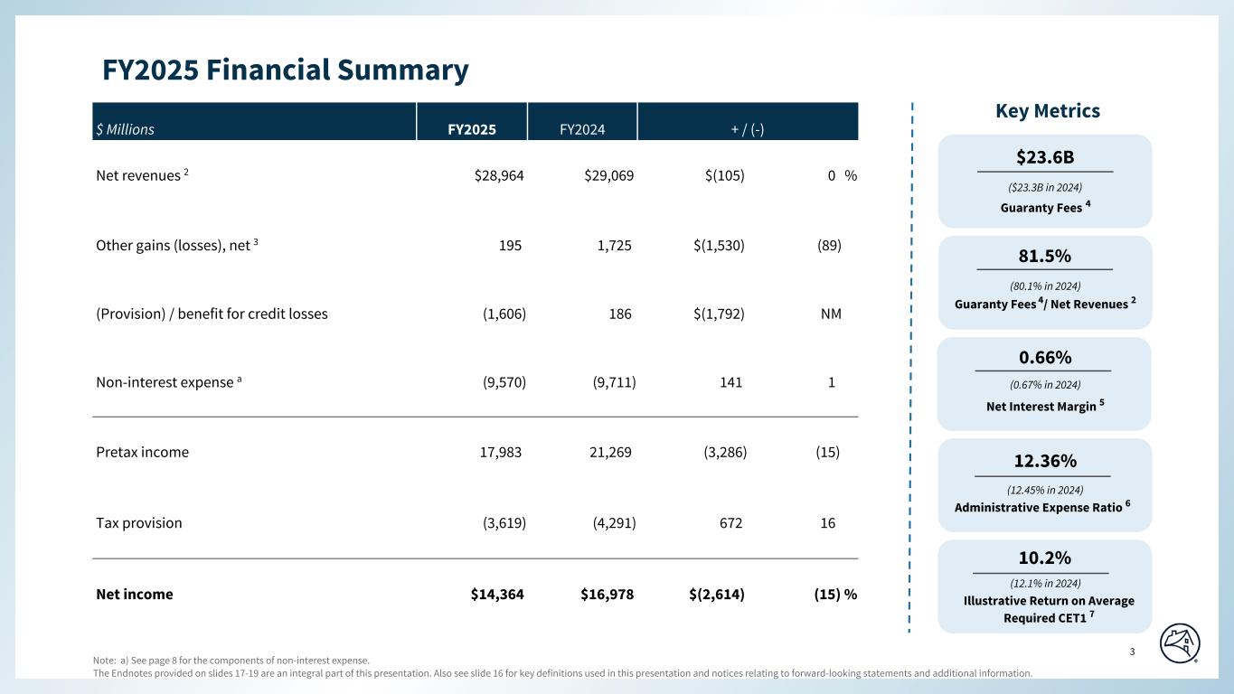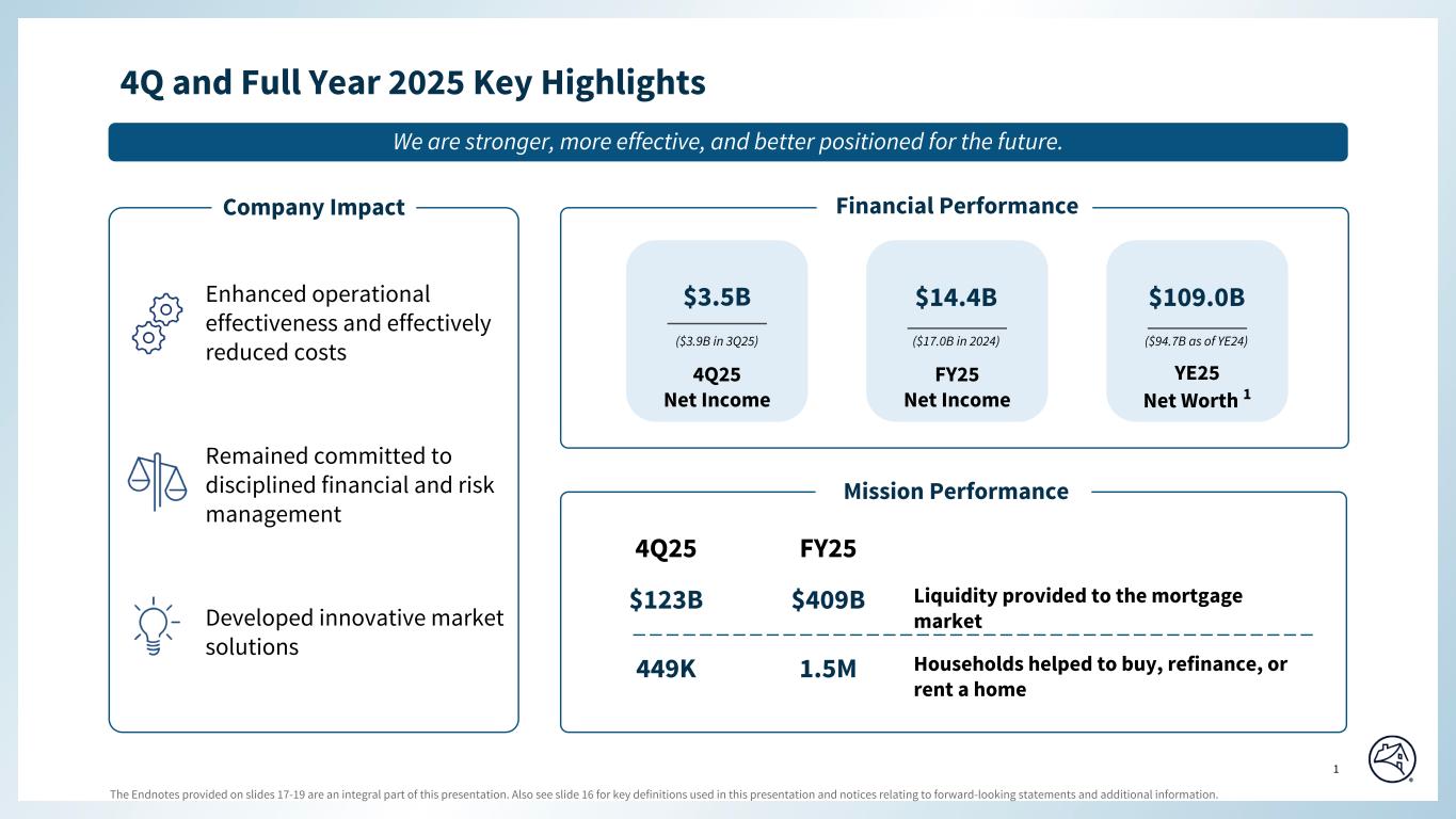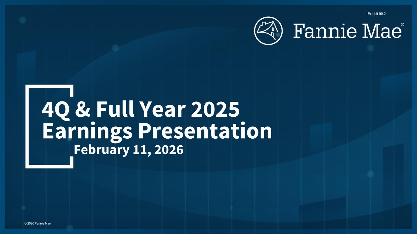 TABLE OF CONTENTS Page Consolidated Results Selected Financial Data 1 Consolidated Statements of Income 2 Consolidated Balance Sheets 3 Average Balances of Assets & Liabilities and Annualized Yields 4 Credit-Related Information 5 Regulatory Capital 6 Business Segment Results Single-Family 7 Multifamily 11 © 2026 Fannie Mae Some of the terms and other information in this presentation are defined and discussed more fully in Fannie Mae’s Form 10-K for the year ended December 31, 2025 (“2025 Form 10-K”). This presentation should be reviewed together with the 2025 Form 10-K, which is available at www.fanniemae.com in the “About Us—Investor Relations—SEC Filings” section. Information on or available through the company's website is not part of this supplement. Some of the information in this presentation is based upon information from third-party sources such as sellers and servicers of mortgage loans. Although Fannie Mae generally considers this information reliable, Fannie Mae does not independently verify all reported information. Due to rounding, amounts reported in this presentation may not sum to totals indicated (i.e., 100%), or amounts shown as 100% may not reflect the entire population. Unless otherwise indicated, data is as of December 31, 2025 or for the full year 2025. Data for prior years is as of December 31 or for the full year indicated.