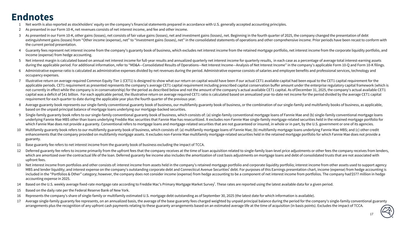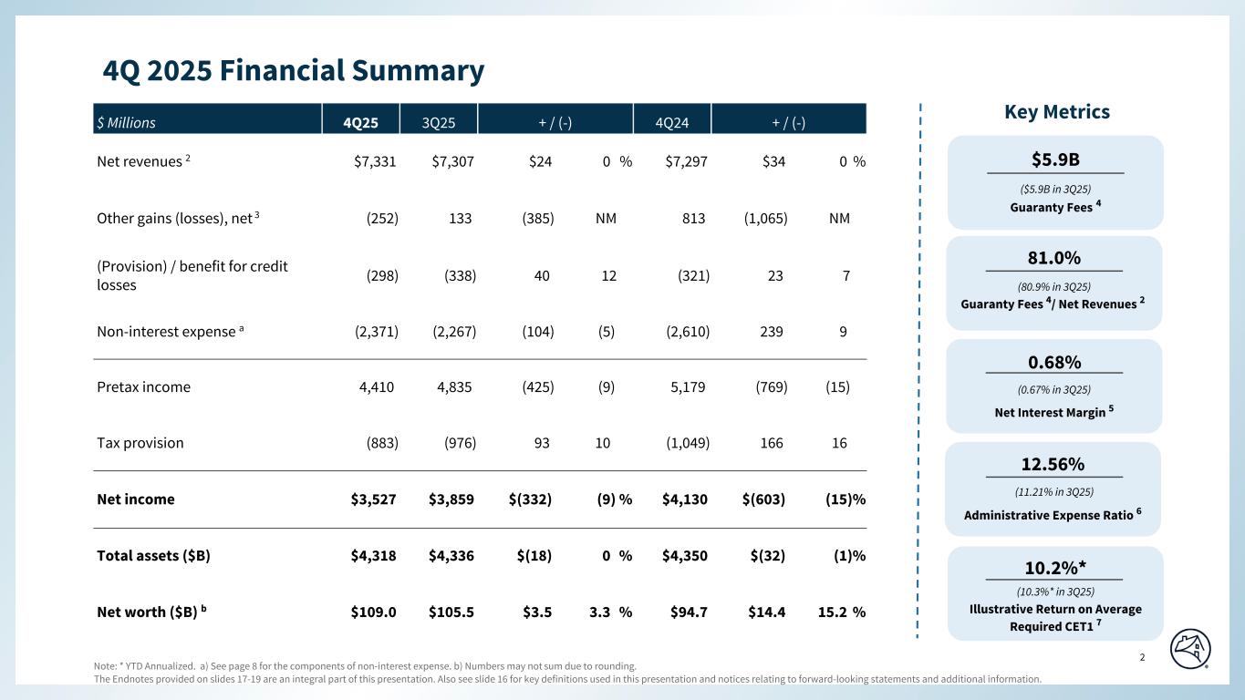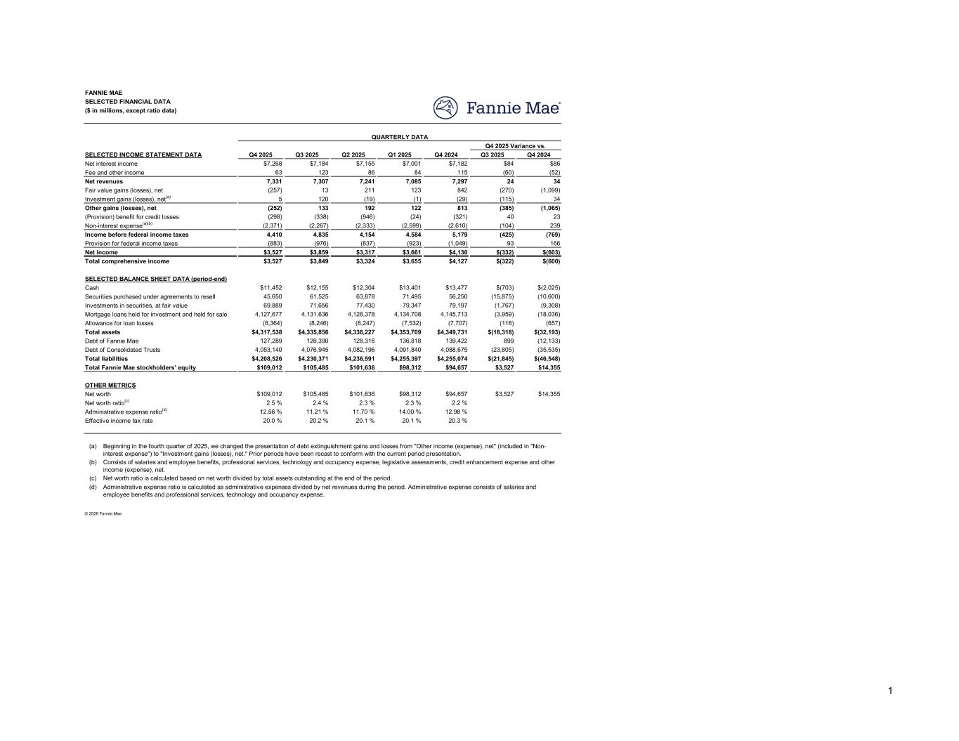 Q4 2025 Q3 2025 Q2 2025 Q1 2025 Q4 2024 Q3 2025 Q4 2024 $7,268 $7,184 $7,155 $7,001 $7,182 $84 $86 63 123 86 84 115 (60) (52) 7,331 7,307 7,241 7,085 7,297 24 34 (257) 13 211 123 842 (270) (1,099) 5 120 (19) (1) (29) (115) 34 (252) 133 192 122 813 (385) (1,065) (298) (338) (946) (24) (321) 40 23 (2,371) (2,267) (2,333) (2,599) (2,610) (104) 239 4,410 4,835 4,154 4,584 5,179 (425) (769) (883) (976) (837) (923) (1,049) 93 166 $3,527 $3,859 $3,317 $3,661 $4,130 $(332) $(603) $3,527 $3,849 $3,324 $3,655 $4,127 $(322) $(600) $11,452 $12,155 $12,304 $13,401 $13,477 $(703) $(2,025) 45,650 61,525 63,878 71,495 56,250 (15,875) (10,600) 69,889 71,656 77,430 79,347 79,197 (1,767) (9,308) 4,127,677 4,131,636 4,128,378 4,134,708 4,145,713 (3,959) (18,036) (8,364) (8,246) (8,247) (7,532) (7,707) (118) (657) $4,317,538 $4,335,856 $4,338,227 $4,353,709 $4,349,731 $(18,318) $(32,193) 127,289 126,390 128,316 136,818 139,422 899 (12,133) 4,053,140 4,076,945 4,082,196 4,091,840 4,088,675 (23,805) (35,535) $4,208,526 $4,230,371 $4,236,591 $4,255,397 $4,255,074 $(21,845) $(46,548) $109,012 $105,485 $101,636 $98,312 $94,657 $3,527 $14,355 $109,012 $105,485 $101,636 $98,312 $94,657 $3,527 $14,355 2.5 % 2.4 % 2.3 % 2.3 % 2.2 % 12.56 % 11.21 % 11.70 % 14.00 % 12.98 % 20.0 % 20.2 % 20.1 % 20.1 % 20.3 % (a) (b) (c) (d) FANNIE MAE SELECTED FINANCIAL DATA ($ in millions, except ratio data) SELECTED INCOME STATEMENT DATA QUARTERLY DATA Q4 2025 Variance vs. Net revenues Net interest income Fee and other income Fair value gains (losses), net Investment gains (losses), net(a) Other gains (losses), net Non-interest expense(a)(b) Income before federal income taxes (Provision) benefit for credit losses Total comprehensive income Net income Provision for federal income taxes Investments in securities, at fair value Securities purchased under agreements to resell SELECTED BALANCE SHEET DATA (period-end) Cash Mortgage loans held for investment and held for sale Allowance for loan losses Total assets Debt of Fannie Mae Total Fannie Mae stockholders’ equity Total liabilities Debt of Consolidated Trusts © 2026 Fannie Mae Net worth ratio(c) OTHER METRICS Net worth Effective income tax rate Administrative expense ratio(d) Net worth ratio is calculated based on net worth divided by total assets outstanding at the end of the period. Administrative expense ratio is calculated as administrative expenses divided by net revenues during the period. Administrative expense consists of salaries and employee benefits and professional services, technology and occupancy expense. Beginning in the fourth quarter of 2025, we changed the presentation of debt extinguishment gains and losses from "Other income (expense), net" (included in "Non- interest expense") to "Investment gains (losses), net." Prior periods have been recast to conform with the current period presentation. Consists of salaries and employee benefits, professional services, technology and occupancy expense, legislative assessments, credit enhancement expense and other income (expense), net. 1