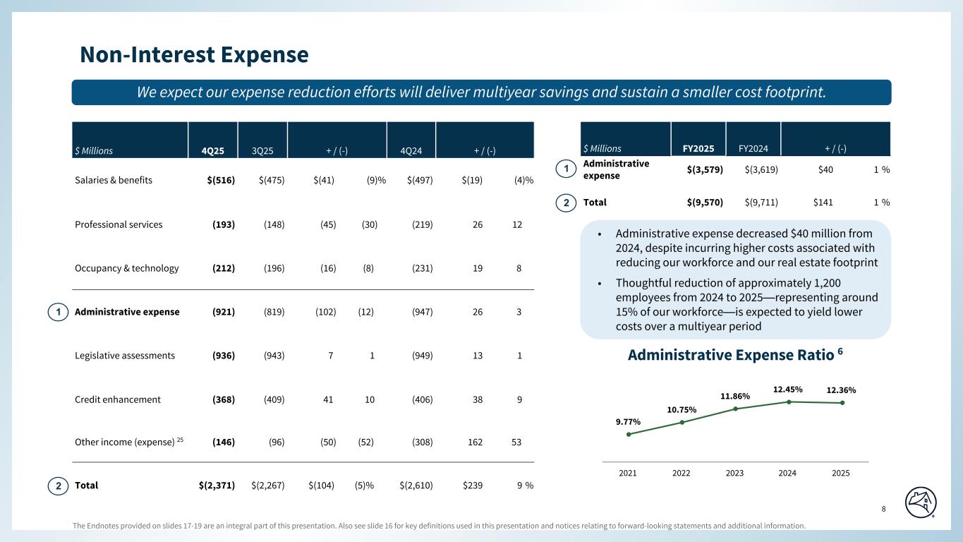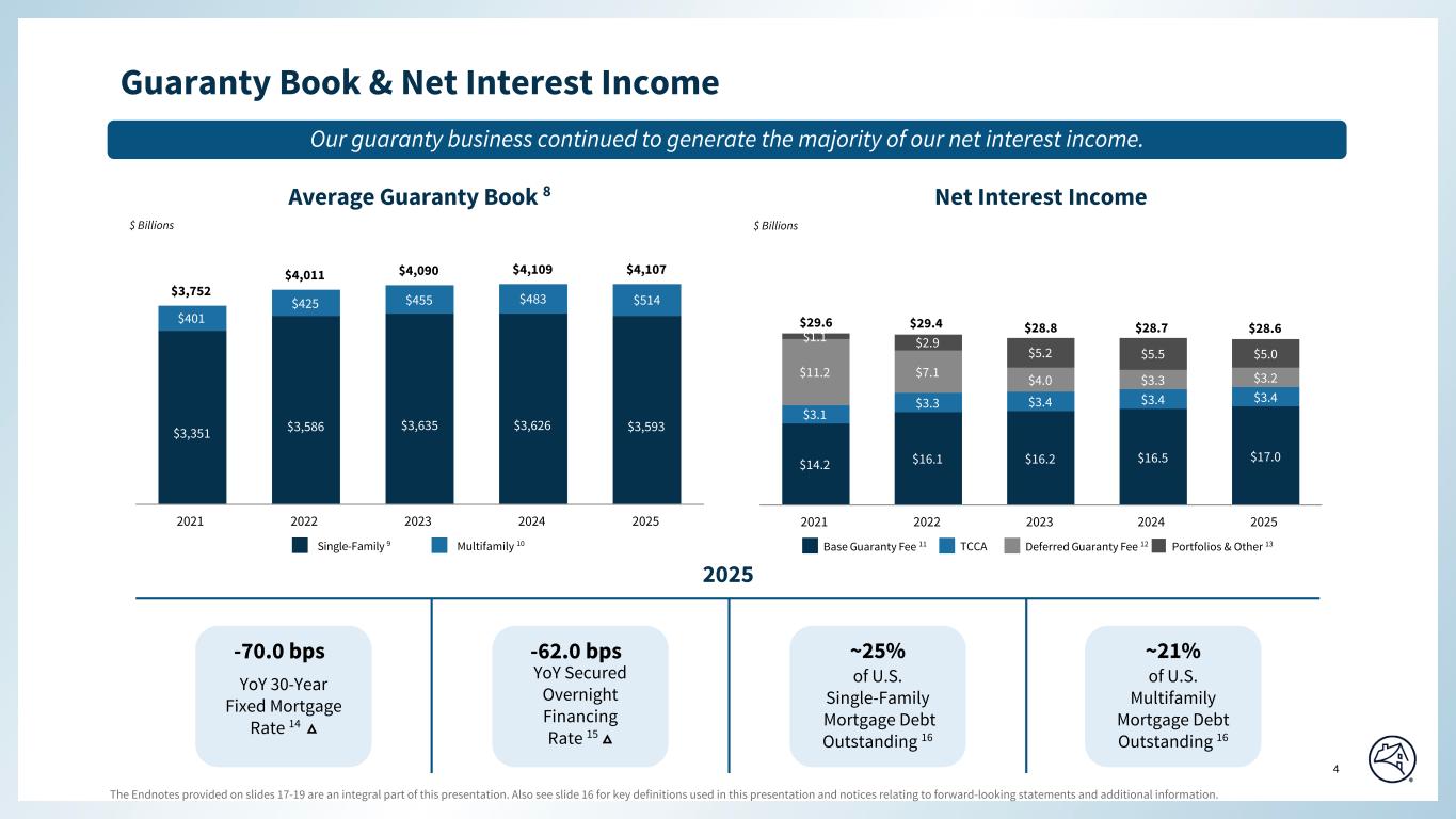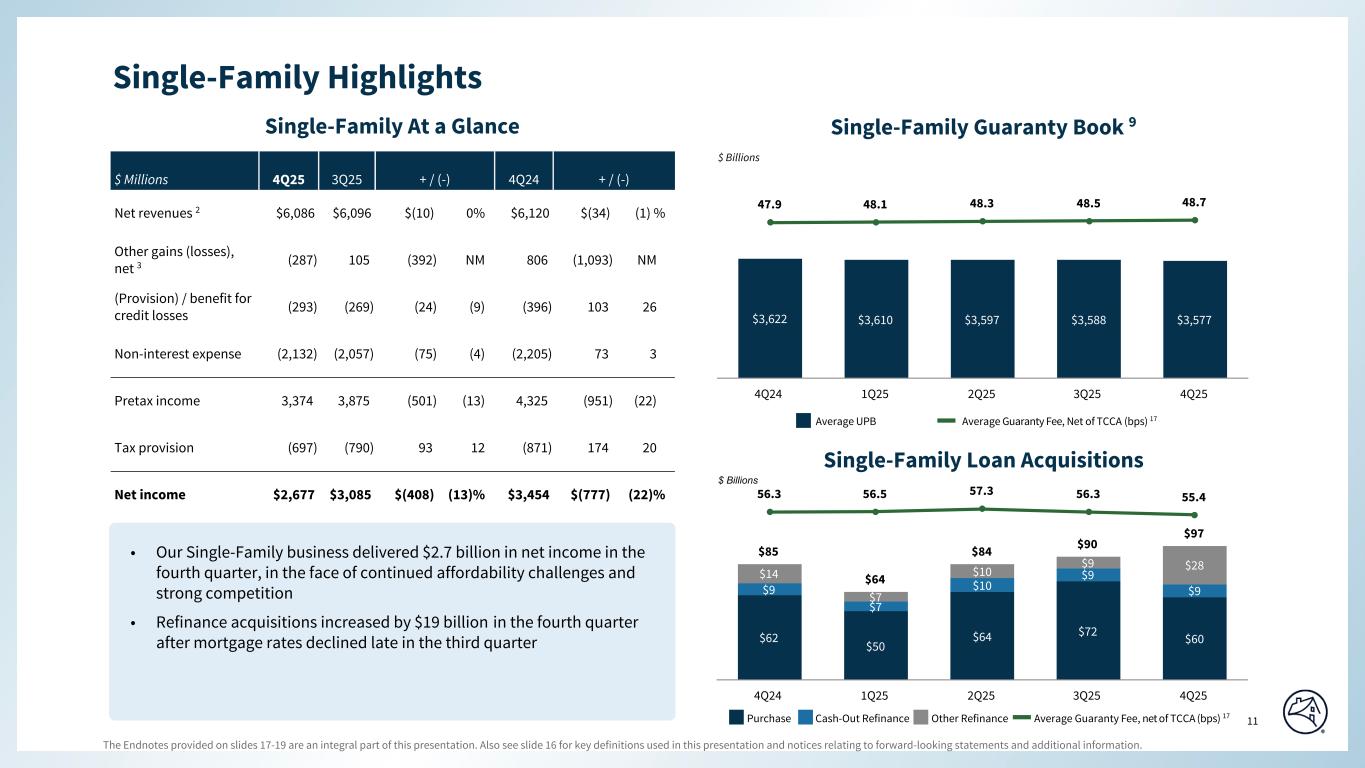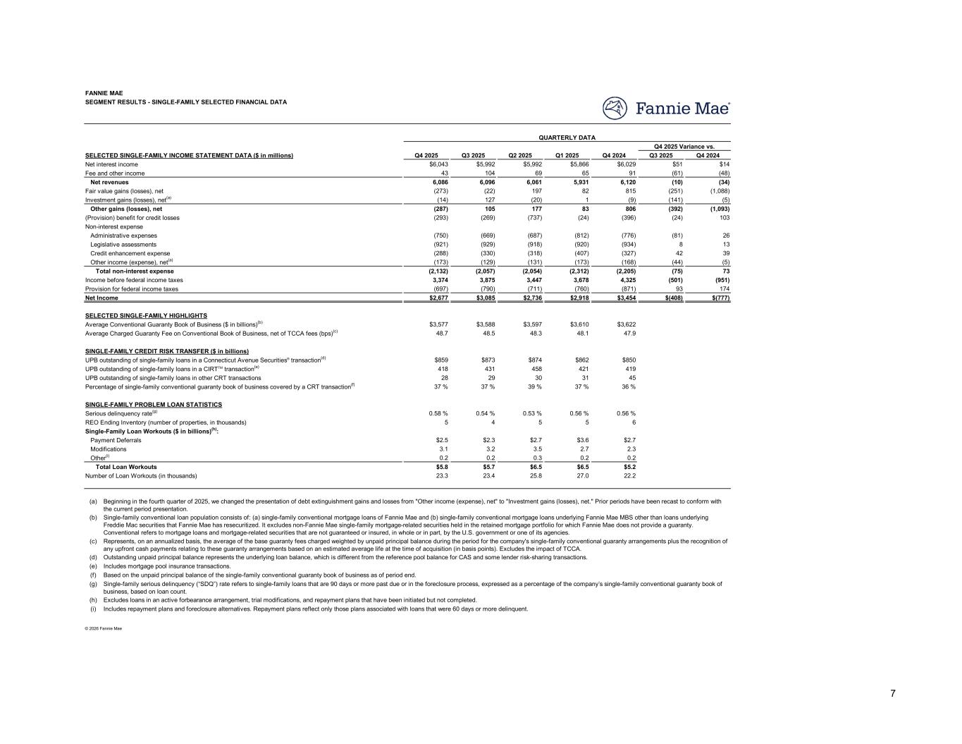 Q4 2025 Q3 2025 Q2 2025 Q1 2025 Q4 2024 Q3 2025 Q4 2024 $6,043 $5,992 $5,992 $5,866 $6,029 $51 $14 43 104 69 65 91 (61) (48) 6,086 6,096 6,061 5,931 6,120 (10) (34) (273) (22) 197 82 815 (251) (1,088) (14) 127 (20) 1 (9) (141) (5) (287) 105 177 83 806 (392) (1,093) (293) (269) (737) (24) (396) (24) 103 (750) (669) (687) (812) (776) (81) 26 (921) (929) (918) (920) (934) 8 13 (288) (330) (318) (407) (327) 42 39 (173) (129) (131) (173) (168) (44) (5) (2,132) (2,057) (2,054) (2,312) (2,205) (75) 73 3,374 3,875 3,447 3,678 4,325 (501) (951) (697) (790) (711) (760) (871) 93 174 $2,677 $3,085 $2,736 $2,918 $3,454 $(408) $(777) $3,577 $3,588 $3,597 $3,610 $3,622 48.7 48.5 48.3 48.1 47.9 $859 $873 $874 $862 $850 418 431 458 421 419 28 29 30 31 45 37 % 37 % 39 % 37 % 36 % 0.58 % 0.54 % 0.53 % 0.56 % 0.56 % 5 4 5 5 6 $2.5 $2.3 $2.7 $3.6 $2.7 3.1 3.2 3.5 2.7 2.3 0.2 0.2 0.3 0.2 0.2 $5.8 $5.7 $6.5 $6.5 $5.2 23.3 23.4 25.8 27.0 22.2 (a) (b) (c) (d) (e) (f) (g) (h) (i) SEGMENT RESULTS - SINGLE-FAMILY SELECTED FINANCIAL DATA FANNIE MAE Net interest income SELECTED SINGLE-FAMILY INCOME STATEMENT DATA ($ in millions) Q4 2025 Variance vs. QUARTERLY DATA Net revenues Fee and other income Fair value gains (losses), net Non-interest expense (Provision) benefit for credit losses Investment gains (losses), net(a) Other gains (losses), net Legislative assessments Administrative expenses Credit enhancement expense Other income (expense), net(a) Income before federal income taxes Total non-interest expense Net Income Provision for federal income taxes SELECTED SINGLE-FAMILY HIGHLIGHTS Average Charged Guaranty Fee on Conventional Book of Business, net of TCCA fees (bps)(c) Average Conventional Guaranty Book of Business ($ in billions)(b) SINGLE-FAMILY CREDIT RISK TRANSFER ($ in billions) UPB outstanding of single-family loans in a Connecticut Avenue Securities® transaction(d) UPB outstanding of single-family loans in a CIRTTM transaction(e) Percentage of single-family conventional guaranty book of business covered by a CRT transaction(f) UPB outstanding of single-family loans in other CRT transactions Includes mortgage pool insurance transactions. Outstanding unpaid principal balance represents the underlying loan balance, which is different from the reference pool balance for CAS and some lender risk-sharing transactions. Represents, on an annualized basis, the average of the base guaranty fees charged weighted by unpaid principal balance during the period for the company's single-family conventional guaranty arrangements plus the recognition of any upfront cash payments relating to these guaranty arrangements based on an estimated average life at the time of acquisition (in basis points). Excludes the impact of TCCA. Beginning in the fourth quarter of 2025, we changed the presentation of debt extinguishment gains and losses from "Other income (expense), net" to "Investment gains (losses), net." Prior periods have been recast to conform with the current period presentation. Single-family conventional loan population consists of: (a) single-family conventional mortgage loans of Fannie Mae and (b) single-family conventional mortgage loans underlying Fannie Mae MBS other than loans underlying Freddie Mac securities that Fannie Mae has resecuritized. It excludes non-Fannie Mae single-family mortgage-related securities held in the retained mortgage portfolio for which Fannie Mae does not provide a guaranty. Conventional refers to mortgage loans and mortgage-related securities that are not guaranteed or insured, in whole or in part, by the U.S. government or one of its agencies. SINGLE-FAMILY PROBLEM LOAN STATISTICS Serious delinquency rate(g) REO Ending Inventory (number of properties, in thousands) Payment Deferrals Single-Family Loan Workouts ($ in billions)(h): Other(i) Modifications Total Loan Workouts Number of Loan Workouts (in thousands) © 2026 Fannie Mae Based on the unpaid principal balance of the single-family conventional guaranty book of business as of period end. Single-family serious delinquency (“SDQ”) rate refers to single-family loans that are 90 days or more past due or in the foreclosure process, expressed as a percentage of the company’s single-family conventional guaranty book of business, based on loan count. Includes repayment plans and foreclosure alternatives. Repayment plans reflect only those plans associated with loans that were 60 days or more delinquent. Excludes loans in an active forbearance arrangement, trial modifications, and repayment plans that have been initiated but not completed. 7