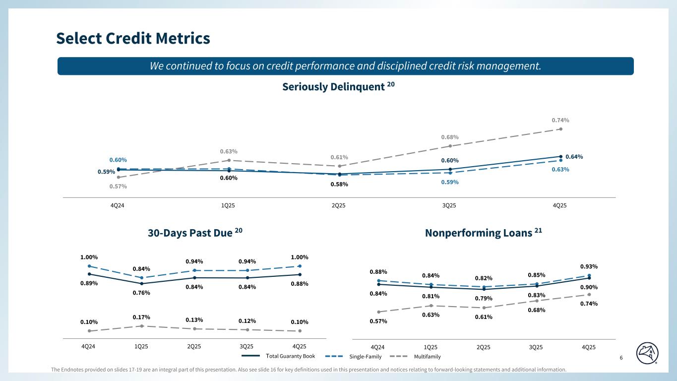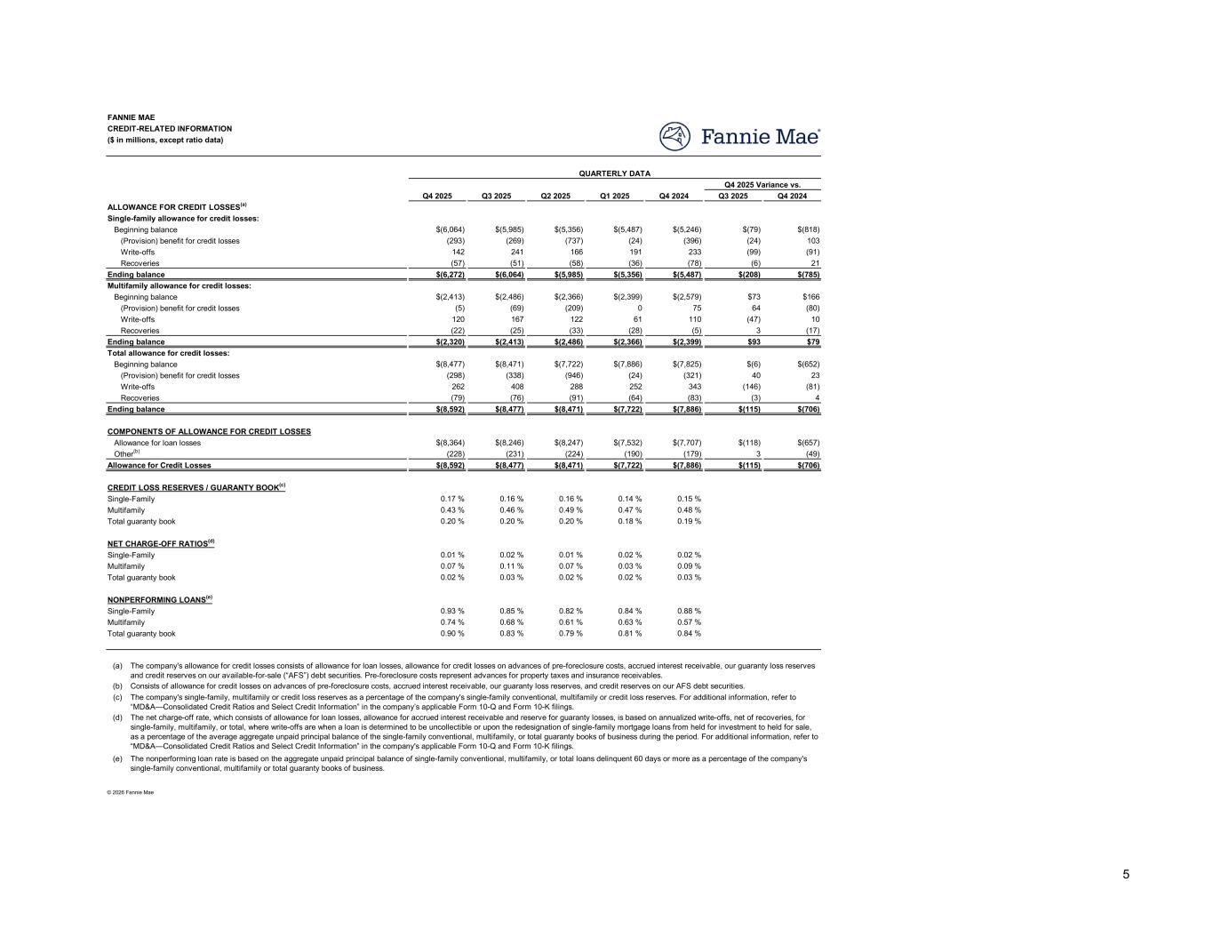 Q4 2025 Q3 2025 Q2 2025 Q1 2025 Q4 2024 Q3 2025 Q4 2024 $(6,064) $(5,985) $(5,356) $(5,487) $(5,246) $(79) $(818) (293) (269) (737) (24) (396) (24) 103 142 241 166 191 233 (99) (91) (57) (51) (58) (36) (78) (6) 21 $(6,272) $(6,064) $(5,985) $(5,356) $(5,487) $(208) $(785) $(2,413) $(2,486) $(2,366) $(2,399) $(2,579) $73 $166 (5) (69) (209) 0 75 64 (80) 120 167 122 61 110 (47) 10 (22) (25) (33) (28) (5) 3 (17) $(2,320) $(2,413) $(2,486) $(2,366) $(2,399) $93 $79 $(8,477) $(8,471) $(7,722) $(7,886) $(7,825) $(6) $(652) (298) (338) (946) (24) (321) 40 23 262 408 288 252 343 (146) (81) (79) (76) (91) (64) (83) (3) 4 $(8,592) $(8,477) $(8,471) $(7,722) $(7,886) $(115) $(706) $(8,364) $(8,246) $(8,247) $(7,532) $(7,707) $(118) $(657) (228) (231) (224) (190) (179) 3 (49) $(8,592) $(8,477) $(8,471) $(7,722) $(7,886) $(115) $(706) 0.17 % 0.16 % 0.16 % 0.14 % 0.15 % 0.43 % 0.46 % 0.49 % 0.47 % 0.48 % 0.20 % 0.20 % 0.20 % 0.18 % 0.19 % 0.01 % 0.02 % 0.01 % 0.02 % 0.02 % 0.07 % 0.11 % 0.07 % 0.03 % 0.09 % 0.02 % 0.03 % 0.02 % 0.02 % 0.03 % 0.93 % 0.85 % 0.82 % 0.84 % 0.88 % 0.74 % 0.68 % 0.61 % 0.63 % 0.57 % 0.90 % 0.83 % 0.79 % 0.81 % 0.84 % (a) (b) (c) (d) (e) CREDIT-RELATED INFORMATION FANNIE MAE ($ in millions, except ratio data) Q4 2025 Variance vs. QUARTERLY DATA Single-family allowance for credit losses: ALLOWANCE FOR CREDIT LOSSES(a) Beginning balance (Provision) benefit for credit losses Recoveries Write-offs Multifamily allowance for credit losses: Ending balance Beginning balance (Provision) benefit for credit losses Recoveries Write-offs Total allowance for credit losses: Ending balance Beginning balance (Provision) benefit for credit losses Recoveries Write-offs Ending balance CREDIT LOSS RESERVES / GUARANTY BOOK(c) COMPONENTS OF ALLOWANCE FOR CREDIT LOSSES Single-Family Allowance for loan losses Other(b) The nonperforming loan rate is based on the aggregate unpaid principal balance of single-family conventional, multifamily, or total loans delinquent 60 days or more as a percentage of the company's single-family conventional, multifamily or total guaranty books of business. The net charge-off rate, which consists of allowance for loan losses, allowance for accrued interest receivable and reserve for guaranty losses, is based on annualized write-offs, net of recoveries, for single-family, multifamily, or total, where write-offs are when a loan is determined to be uncollectible or upon the redesignation of single-family mortgage loans from held for investment to held for sale, as a percentage of the average aggregate unpaid principal balance of the single-family conventional, multifamily, or total guaranty books of business during the period. For additional information, refer to “MD&A—Consolidated Credit Ratios and Select Credit Information” in the company's applicable Form 10-Q and Form 10-K filings. The company's single-family, multifamily or credit loss reserves as a percentage of the company's single-family conventional, multifamily or credit loss reserves. For additional information, refer to “MD&A—Consolidated Credit Ratios and Select Credit Information” in the company’s applicable Form 10-Q and Form 10-K filings. NET CHARGE-OFF RATIOS(d) Single-Family Multifamily Total guaranty book Single-Family NONPERFORMING LOANS(e) Multifamily Total guaranty book © 2026 Fannie Mae The company's allowance for credit losses consists of allowance for loan losses, allowance for credit losses on advances of pre-foreclosure costs, accrued interest receivable, our guaranty loss reserves and credit reserves on our available-for-sale (“AFS”) debt securities. Pre-foreclosure costs represent advances for property taxes and insurance receivables. Consists of allowance for credit losses on advances of pre-foreclosure costs, accrued interest receivable, our guaranty loss reserves, and credit reserves on our AFS debt securities. Total guaranty book Allowance for Credit Losses Multifamily 5