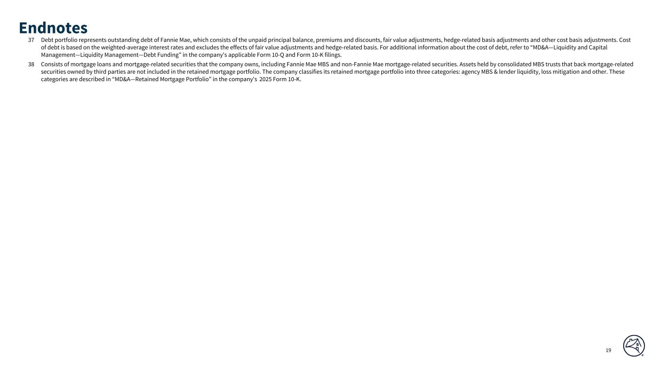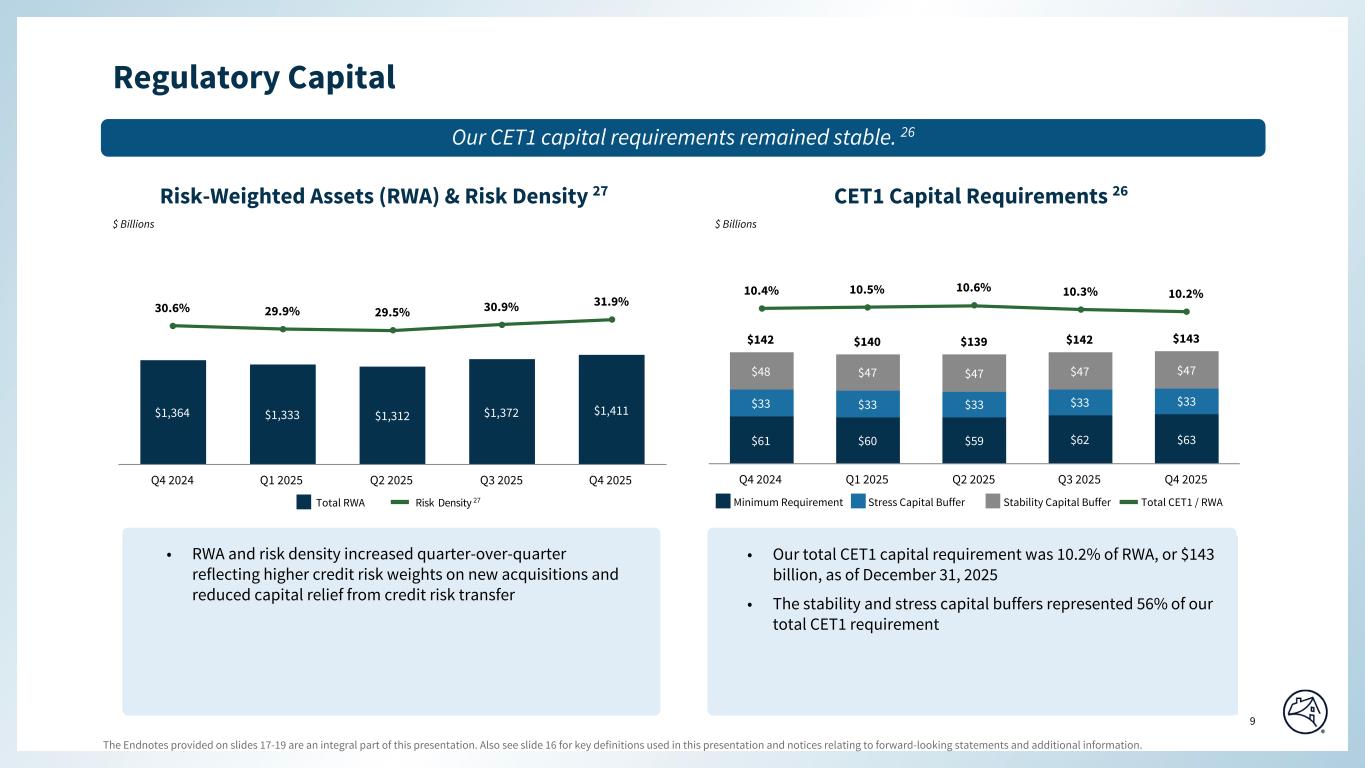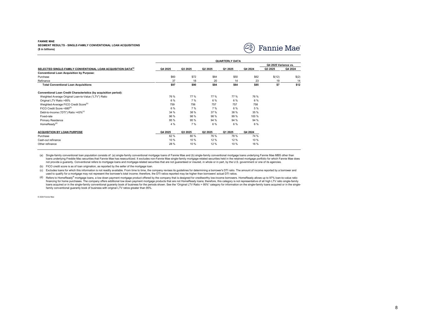 Q4 2025 Q3 2025 Q2 2025 Q1 2025 Q4 2024 Q3 2025 Q4 2024 $60 $72 $64 $50 $62 $(12) $(2) 37 18 20 14 23 19 14 $97 $90 $84 $64 $85 $7 $12 76 % 77 % 77 % 77 % 76 % 6 % 7 % 6 % 6 % 6 % 759 756 757 757 758 6 % 7 % 7 % 6 % 5 % 34 % 38 % 37 % 38 % 35 % 96 % 98 % 98 % 99 % 100 % 95 % 95 % 94 % 94 % 94 % 4 % 7 % 6 % 6 % 6 % Q4 2025 Q3 2025 Q2 2025 Q1 2025 Q4 2024 62 % 80 % 76 % 78 % 74 % 10 % 10 % 12 % 12 % 10 % 28 % 10 % 12 % 10 % 16 % (a) (b) (c) (d) SEGMENT RESULTS - SINGLE-FAMILY CONVENTIONAL LOAN ACQUISITIONS FANNIE MAE ($ in billions) SELECTED SINGLE-FAMILY CONVENTIONAL LOAN ACQUISITION DATA(a) Q4 2025 Variance vs. QUARTERLY DATA Purchase Conventional Loan Acquisition by Purpose: Refinance Total Conventional Loan Acquisitions Conventional Loan Credit Characteristics (by acquisition period): Original LTV Ratio >95% Weighted Average Original Loan-to-Value (“LTV”) Ratio Weighted-Average FICO Credit Score(b) FICO Credit Score <680(b) Fixed-rate Debt-to-Income (“DTI”) Ratio >43%(c) HomeReady(d) Primary Residence Excludes loans for which this information is not readily available. From time to time, the company revises its guidelines for determining a borrower's DTI ratio. The amount of income reported by a borrower and used to qualify for a mortgage may not represent the borrower's total income; therefore, the DTI ratios reported may be higher than borrowers' actual DTI ratios. FICO credit score is as of loan origination, as reported by the seller of the mortgage loan. Refers to HomeReady® mortgage loans, a low down payment mortgage product offered by the company that is designed for creditworthy low-income borrowers. HomeReady allows up to 97% loan-to-value ratio financing for home purchases. The company offers additional low down payment mortgage products that are not HomeReady loans; therefore, this category is not representative of all high LTV ratio single-family loans acquired or in the single-family conventional guaranty book of business for the periods shown. See the “Original LTV Ratio > 95%” category for information on the single-family loans acquired or in the single- family conventional guaranty book of business with original LTV ratios greater than 95%. © 2026 Fannie Mae ACQUISITION BY LOAN PURPOSE Cash-out refinance Purchase Other refinance Single-family conventional loan population consists of: (a) single-family conventional mortgage loans of Fannie Mae and (b) single-family conventional mortgage loans underlying Fannie Mae MBS other than loans underlying Freddie Mac securities that Fannie Mae has resecuritized. It excludes non-Fannie Mae single-family mortgage-related securities held in the retained mortgage portfolio for which Fannie Mae does not provide a guaranty. Conventional refers to mortgage loans and mortgage-related securities that are not guaranteed or insured, in whole or in part, by the U.S. government or one of its agencies. 8