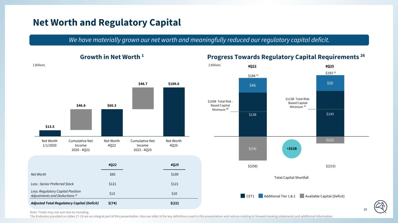 Q4 2025 Q3 2025 Q2 2025 Q1 2025 Q4 2024 Q3 2025 Q4 2024 $(3) $(7) $(11) $(15) $(18) $4 $15 (41) (44) (48) (52) (56) 3 15 (22) (25) (29) (33) (37) 3 15 (22) (25) (29) (33) (37) 3 15 1,411 1,372 1,312 1,333 1,364 39 47 (0.2)% (0.5)% (0.8)% (1.1)% (1.3)% 0.3 % 1.1 % (2.9)% (3.2)% (3.7)% (3.9)% (4.1)% 0.3 % 1.2 % (1.6)% (1.8)% (2.2)% (2.5)% (2.7)% 0.2 % 1.1 % (1.6)% (1.8)% (2.2)% (2.5)% (2.7)% 0.2 % 1.1 % $(12) $(15) $(19) $(23) $(26) $3 $14 (22) (25) (29) (33) (37) 3 15 4,423 4,443 4,446 4,462 4,460 (20) (37) (0.3)% (0.3)% (0.4)% (0.5)% (0.6)% 0.0 % 0.3 % (0.5)% (0.6)% (0.7)% (0.7)% (0.8)% 0.1 % 0.3 % $(44,481) $(48,457) $(52,107) $(55,854) $(60,404) $3,976 $15,923 3,527 3,859 3,317 3,661 4,130 (332) (603) 0 (10) 7 (6) (3) 10 3 (172) (127) (326) (92) (423) (45) 251 3,699 3,976 3,650 3,747 4,550 (277) (851) Standardized CET1 capital, ending balance $(40,782) $(44,481) $(48,457) $(52,107) $(55,854) $3,699 $15,072 (a) (b) (c) REGULATORY CAPITAL FANNIE MAE ($ in billions, except ratio data) AVAILABLE CAPITAL (DEFICIT)(a)(b) Q4 2025 Variance vs. QUARTERLY DATA Standardized Risk-based capital metrics Total capital (statutory) CET1 capital Adjusted total capital Tier 1 capital Total capital (statutory) ratio Risk-weighted assets CET1 capital ratio Tier 1 capital ratio Adjusted total capital ratio Core capital (statutory) Leverage-based capital metrics Tier 1 capital Adjusted total assets Tier 1 capital ratio Core capital (statutory) ratio CET1 CAPITAL ROLLFORWARD ($ in millions) Standardized CET1 capital beginning balance Net income Less: Changes in deferred tax assets(c) Changes in accumulated other comprehensive income (loss), net of taxes © 2026 Fannie Mae Negative capital amounts and ratios indicate capital deficits. Represents changes in deferred tax assets arising from temporary differences that exceed 10% of common equity tier 1 capital and other regulatory adjustments. Ratios are calculated as a percentage of risk-weighted assets for risk-based capital metrics and as a percentage of adjusted total assets for leverage capital metrics. Changes in standardized CET1 capital 6