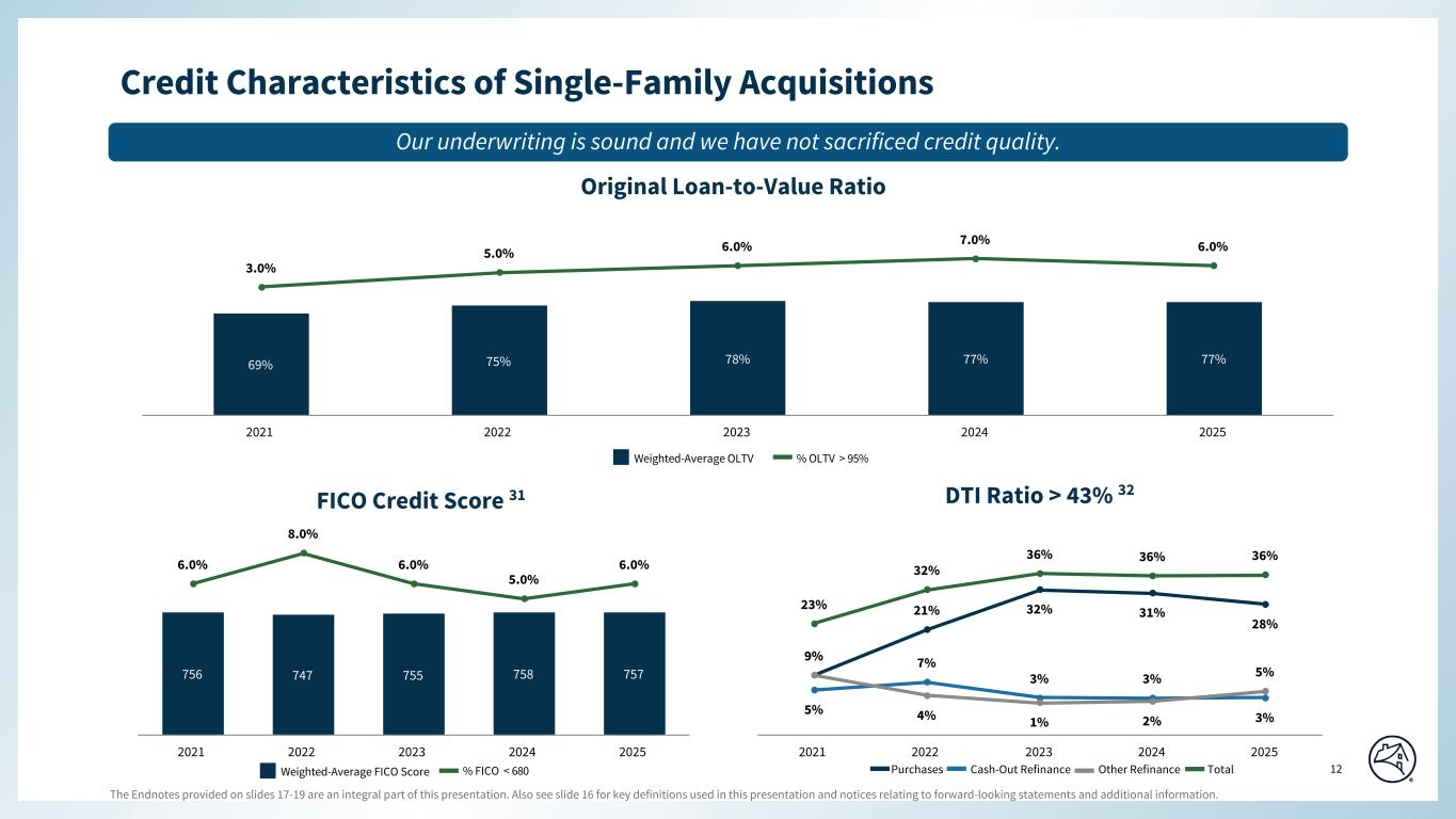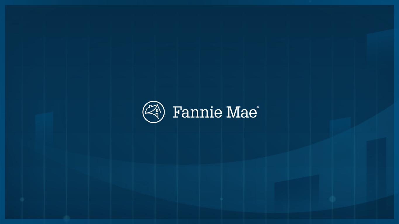 OLTV Ratio > 95% Home Ready(g) FICO Credit Score < 680(f) DTI Ratio > 43%(h) $187.0 $134.9 $259.6 $968.1 $186,118 $184,056 $162,391 $239,710 5 % 4 % 7 % 27 % 86 % 77 % 41 % 53 % 1.30 % 1.09 % 2.06 % 0.88 % 13 % 8 % 34 % 36 % 100 % 86 % 74 % 76 % 100 % 31 % 6 % 6 % 69 % 66 % 48 % 56 % 740 745 653 744 8 % 8 % 100 % 9 % 4.8 % 4.7 % 4.6 % 4.6 % (a) (b) (c) (d) (e) (f) (g) (h) FANNIE MAE SEGMENT RESULTS - SINGLE-FAMILY CONVENTIONAL GUARANTY BOOK OF BUSINESS As of December 31, 2025 SELECTED CREDIT CHARACTERISTICS OF SINGLE-FAMILY CONVENTIONAL GUARANTY BOOK OF BUSINESS(a) Average UPB Total UPB ($ in billions) BY LOAN FEATURE Share of Loans with Credit Enhancement(b) Share of SF Conventional Guaranty Book Serious Delinquency Rate (by loan count)(c) Share of Seriously Delinquent Loan Population(d) OLTV Ratio >95% Weighted-Average OLTV Ratio Weighted-Average FICO Credit Score(f) Weighted-Average Mark-to-Market LTV Ratio(e) FICO Credit Score <680(f) Weighted-Average Borrower Interest Rate Single-family conventional loan population consists of: (a) single-family conventional mortgage loans of Fannie Mae and (b) single-family conventional mortgage loans underlying Fannie Mae MBS other than loans underlying Freddie Mac securities that Fannie Mae has resecuritized. It excludes non-Fannie Mae single-family mortgage-related securities held in the retained mortgage portfolio for which Fannie Mae does not provide a guaranty. Conventional refers to mortgage loans and mortgage-related securities that are not guaranteed or insured, in whole or in part, by the U.S. government or one of its agencies. Percentage of loans in each category, measured by unpaid principal balance, included in an agreement used to reduce credit risk by requiring collateral, letters of credit, mortgage insurance, corporate guarantees, inclusion in a credit risk transfer transaction reference pool, or other agreement that provides for Fannie Mae's compensation to some degree in the event of a financial loss relating to the loan. Single-family serious delinquency (“SDQ”) rate refers to single-family loans that are 90 days or more past due or in the foreclosure process, expressed as a percentage of the company’s single-family conventional guaranty book of business, based on loan count. Single-family SDQ rate for loans in a particular category refers to SDQ loans in the applicable category, divided by the number of loans in the single-family conventional guaranty book of business in that category. Calculated based on the number of single-family loans that were seriously delinquent for each category divided by the total number of single-family conventional loans that were seriously delinquent. © 2026 Fannie Mae Refers to HomeReady® mortgage loans, a low down payment mortgage product offered by the company that is designed for creditworthy low-income borrowers. HomeReady allows up to 97% loan-to-value ratio financing for home purchases. The company offers additional low down payment mortgage products that are not HomeReady loans; therefore, this category is not representative of all high LTV ratio single-family loans acquired or in the single-family conventional guaranty book of business for the periods shown. See the “OLTV Ratio > 95%” category for information on the single-family loans acquired or in the single-family conventional guaranty book of business with original LTV ratios greater than 95%. Excludes loans for which this information is not readily available. From time to time, the company revises its guidelines for determining a borrower's DTI ratio. The amount of income reported by a borrower and used to qualify for a mortgage may not represent the borrower's total income; therefore, the DTI ratios reported may be higher than borrowers' actual DTI ratios. The average estimated mark-to-market LTV ratio is based on the unpaid principal balance of the loan divided by the estimated current value of the property at period end, which the company calculates using an internal valuation model that estimates periodic changes in home value. Excludes loans for which this information is not readily available. FICO credit score is as of loan origination, as reported by the seller of the mortgage loan. 10