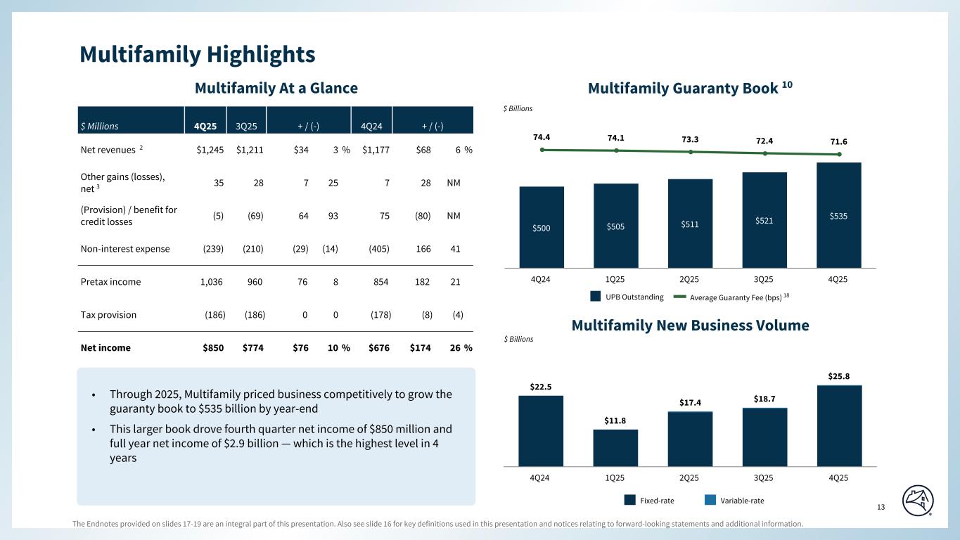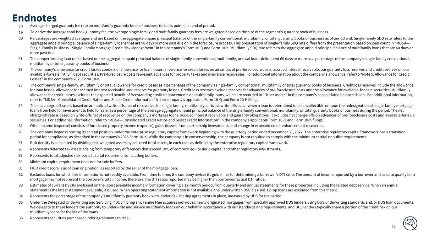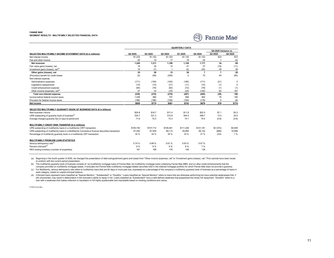 Q4 2025 Q3 2025 Q2 2025 Q1 2025 Q4 2024 Q3 2025 Q4 2024 $1,225 $1,192 $1,163 $1,135 $1,153 $33 $72 20 19 17 19 24 1 (4) 1,245 1,211 1,180 1,154 1,177 34 68 16 35 14 41 27 (19) (11) 19 (7) 1 (2) (20) 26 39 35 28 15 39 7 7 28 (5) (69) (209) 0 75 64 (80) (171) (150) (160) (180) (171) (21) 0 (15) (14) (21) (11) (15) (1) 0 (80) (79) (82) (72) (79) (1) (1) 27 33 (16) (24) (140) (6) 167 (239) (210) (279) (287) (405) (29) 166 1,036 960 707 906 854 76 182 (186) (186) (126) (163) (178) 0 (8) $850 $774 $581 $743 $676 $76 $174 $25.8 $18.7 $17.4 $11.8 $22.5 $7.1 $3.3 534.7 521.3 510.8 504.5 499.7 13.4 35.0 71.6 72.4 73.3 74.1 74.4 (0.8) (2.8) $105,740 $107,712 $109,381 $111,249 $101,181 $(1,972) $4,559 67,040 67,929 69,114 55,894 56,142 (889) 10,898 32 % 34 % 35 % 33 % 31 % (2)% 1 % 0.74 % 0.68 % 0.61 % 0.63 % 0.57 % 6 % 6 % 6 % 6 % 7 % 181 188 176 148 139 (a) (b) (c) (d) SEGMENT RESULTS - MULTIFAMILY SELECTED FINANCIAL DATA FANNIE MAE Net interest income SELECTED MULTIFAMILY INCOME STATEMENT DATA ($ in millions) Q4 2025 Variance vs. QUARTERLY DATA Net revenues Fee and other income Fair value gains (losses), net Non-interest expense Other gains (losses), net Investment gains (losses), net(a) Legislative assessments Administrative expenses (Provision) benefit for credit losses Credit enhancement expense Other income (expense), net(a) Income before federal income taxes Total non-interest expense Net income Provision for federal income taxes SELECTED MULTIFAMILY GUARANTY BOOK OF BUSINESS DATA ($ in billions) UPB outstanding of guaranty book of business(b) New business volume Average charged guaranty fee (in bps) at period end MULTIFAMILY CREDIT RISK TRANSFER ($ in millions) © 2026 Fannie Mae UPB outstanding of multifamily loans in a multifamily CIRT transaction Percentage of multifamily guaranty book in a multifamily CRT transaction UPB outstanding of multifamily loans in a Multifamily Connecticut Avenue Securities transaction Criticized loans represent loans classified as “Special Mention,” “Substandard” or “Doubtful.” Loans classified as “Special Mention” refers to loans that are otherwise performing but have potential weaknesses that, if left uncorrected, may result in deterioration in the borrower’s ability to repay in full. Loans classified as “Substandard” have a well-defined weakness that jeopardizes the timely full repayment. “Doubtful” refers to a loan with a weakness that makes collection or liquidation in full highly questionable and improbable based on existing conditions and values. For Multifamily, serious delinquency rate refers to multifamily loans that are 60 days or more past due, expressed as a percentage of the company’s multifamily guaranty book of business as a percentage of loans in each category, based on unpaid principal balance. Beginning in the fourth quarter of 2025, we changed the presentation of debt extinguishment gains and losses from "Other income (expense), net" to "Investment gains (losses), net." Prior periods have been recast to conform with the current period presentation. The multifamily guaranty book of business consists of: (a) multifamily mortgage loans of Fannie Mae; (b) multifamily mortgage loans underlying Fannie Mae MBS; and (c) other credit enhancements that the company provided on multifamily mortgage assets. It excludes non-Fannie Mae multifamily mortgage-related securities held in the retained mortgage portfolio for which Fannie Mae does not provide a guaranty. MULTIFAMILY PROBLEM LOAN STATISTICS Serious delinquency rate(c) Percent criticized(d) REO ending inventory (number of properties) 11