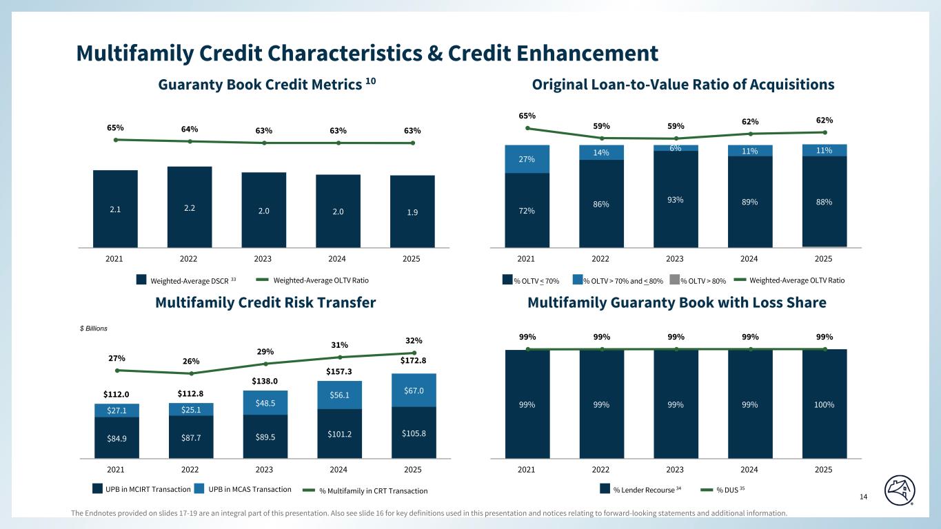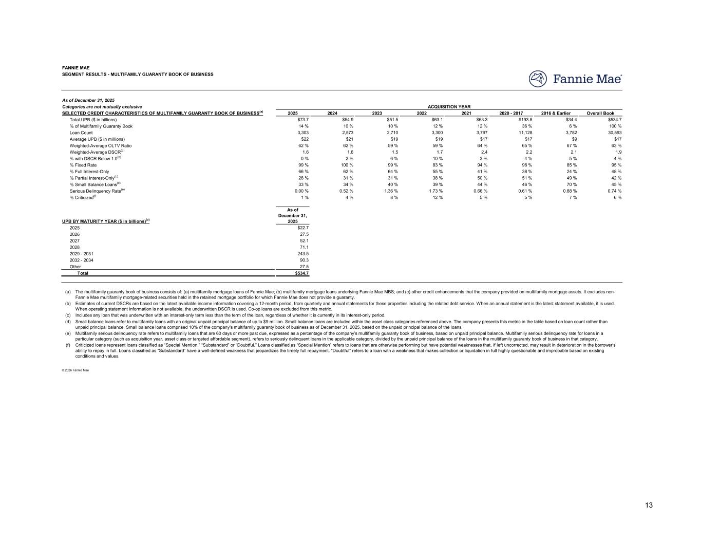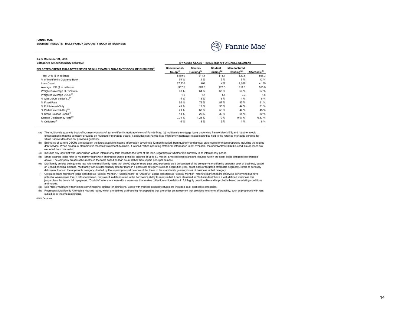 2025 2024 2023 2022 2021 2020 - 2017 2016 & Earlier Overall Book $73.7 $54.9 $51.5 $63.1 $63.3 $193.8 $34.4 $534.7 14 % 10 % 10 % 12 % 12 % 36 % 6 % 100 % 3,303 2,573 2,710 3,300 3,797 11,128 3,782 30,593 $22 $21 $19 $19 $17 $17 $9 $17 62 % 62 % 59 % 59 % 64 % 65 % 67 % 63 % 1.6 1.6 1.5 1.7 2.4 2.2 2.1 1.9 0 % 2 % 6 % 10 % 3 % 4 % 5 % 4 % 99 % 100 % 99 % 83 % 94 % 96 % 85 % 95 % 66 % 62 % 64 % 55 % 41 % 38 % 24 % 48 % 28 % 31 % 31 % 38 % 50 % 51 % 49 % 42 % 33 % 34 % 40 % 39 % 44 % 46 % 70 % 45 % 0.00 % 0.52 % 1.36 % 1.73 % 0.66 % 0.61 % 0.88 % 0.74 % 1 % 4 % 8 % 12 % 5 % 5 % 7 % 6 % As of December 31, 2025 $22.7 27.5 52.1 71.1 243.5 90.3 27.5 $534.7 (a) (b) (c) (d) (e) (f) SEGMENT RESULTS - MULTIFAMILY GUARANTY BOOK OF BUSINESS FANNIE MAE As of December 31, 2025 Categories are not mutually exclusive Total UPB ($ in billions) SELECTED CREDIT CHARACTERISTICS OF MULTIFAMILY GUARANTY BOOK OF BUSINESS(a) ACQUISITION YEAR Loan Count % of Multifamily Guaranty Book Average UPB ($ in millions) Weighted-Average OLTV Ratio % with DSCR Below 1.0(b) Weighted-Average DSCR(b) % Full Interest-Only % Fixed Rate % Partial Interest-Only(c) % Small Balance Loans(d) % Criticized(f) Serious Delinquency Rate(e) UPB BY MATURITY YEAR ($ in billions)(a) 2025 2026 2028 2027 2032 - 2034 2029 - 2031 Other Total Includes any loan that was underwritten with an interest-only term less than the term of the loan, regardless of whether it is currently in its interest-only period. Estimates of current DSCRs are based on the latest available income information covering a 12-month period, from quarterly and annual statements for these properties including the related debt service. When an annual statement is the latest statement available, it is used. When operating statement information is not available, the underwritten DSCR is used. Co-op loans are excluded from this metric. The multifamily guaranty book of business consists of: (a) multifamily mortgage loans of Fannie Mae; (b) multifamily mortgage loans underlying Fannie Mae MBS; and (c) other credit enhancements that the company provided on multifamily mortgage assets. It excludes non- Fannie Mae multifamily mortgage-related securities held in the retained mortgage portfolio for which Fannie Mae does not provide a guaranty. Small balance loans refer to multifamily loans with an original unpaid principal balance of up to $9 million. Small balance loans are included within the asset class categories referenced above. The company presents this metric in the table based on loan count rather than unpaid principal balance. Small balance loans comprised 10% of the company's multifamily guaranty book of business as of December 31, 2025, based on the unpaid principal balance of the loans. Multifamily serious delinquency rate refers to multifamily loans that are 60 days or more past due, expressed as a percentage of the company’s multifamily guaranty book of business, based on unpaid principal balance. Multifamily serious delinquency rate for loans in a particular category (such as acquisition year, asset class or targeted affordable segment), refers to seriously delinquent loans in the applicable category, divided by the unpaid principal balance of the loans in the multifamily guaranty book of business in that category. Criticized loans represent loans classified as “Special Mention,” “Substandard” or “Doubtful.” Loans classified as “Special Mention” refers to loans that are otherwise performing but have potential weaknesses that, if left uncorrected, may result in deterioration in the borrower’s ability to repay in full. Loans classified as “Substandard” have a well-defined weakness that jeopardizes the timely full repayment. “Doubtful” refers to a loan with a weakness that makes collection or liquidation in full highly questionable and improbable based on existing conditions and values. © 2026 Fannie Mae 13