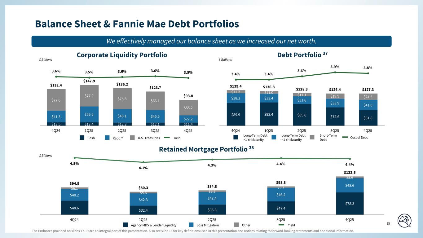 Conventional / Co-op(g) Seniors Housing(g) Student Housing(g) Manufactured Housing(g) Affordable(h) $489.0 $11.5 $11.7 $22.5 $65.3 91 % 2 % 2 % 5 % 12 % 27,736 401 427 2,029 4,139 $17.6 $28.8 $27.5 $11.1 $15.8 63 % 64 % 65 % 60 % 67 % 1.9 1.7 1.8 2.3 1.8 4 % 18 % 5 % 1 % 5 % 95 % 78 % 87 % 95 % 91 % 49 % 19 % 36 % 44 % 31 % 41 % 63 % 59 % 44 % 45 % 44 % 20 % 39 % 66 % 50 % 0.74 % 1.28 % 1.79 % 0.07 % 0.37 % 6 % 18 % 5 % 1 % 8 % (a) (b) (c) (d) (e) (f) (g) (h) SEGMENT RESULTS - MULTIFAMILY GUARANTY BOOK OF BUSINESS FANNIE MAE As of December 31, 2025 Categories are not mutually exclusive Total UPB ($ in billions) SELECTED CREDIT CHARACTERISTICS OF MULTIFAMILY GUARANTY BOOK OF BUSINESS(a) BY ASSET CLASS / TARGETED AFFORDABLE SEGMENT Loan Count % of Multifamily Guaranty Book Average UPB ($ in millions) Weighted-Average OLTV Ratio % with DSCR Below 1.0(b) Weighted-Average DSCR(b) % Full Interest-Only % Fixed Rate % Partial Interest-Only(c) % Small Balance Loans(d) % Criticized(f) Serious Delinquency Rate(e) The multifamily guaranty book of business consists of: (a) multifamily mortgage loans of Fannie Mae; (b) multifamily mortgage loans underlying Fannie Mae MBS; and (c) other credit enhancements that the company provided on multifamily mortgage assets. It excludes non-Fannie Mae multifamily mortgage-related securities held in the retained mortgage portfolio for which Fannie Mae does not provide a guaranty. Estimates of current DSCRs are based on the latest available income information covering a 12-month period, from quarterly and annual statements for these properties including the related debt service. When an annual statement is the latest statement available, it is used. When operating statement information is not available, the underwritten DSCR is used. Co-op loans are excluded from this metric. © 2026 Fannie Mae Represents Multifamily Affordable Housing loans, which are defined as financing for properties that are under an agreement that provides long-term affordability, such as properties with rent subsidies or income restrictions. See https://multifamily.fanniemae.com/financing-options for definitions. Loans with multiple product features are included in all applicable categories. Criticized loans represent loans classified as “Special Mention,” “Substandard” or “Doubtful.” Loans classified as “Special Mention” refers to loans that are otherwise performing but have potential weaknesses that, if left uncorrected, may result in deterioration in the borrower’s ability to repay in full. Loans classified as “Substandard” have a well-defined weakness that jeopardizes the timely full repayment. “Doubtful” refers to a loan with a weakness that makes collection or liquidation in full highly questionable and improbable based on existing conditions and values. Multifamily serious delinquency rate refers to multifamily loans that are 60 days or more past due, expressed as a percentage of the company’s multifamily guaranty book of business, based on unpaid principal balance. Multifamily serious delinquency rate for loans in a particular category (such as acquisition year, asset class or targeted affordable segment), refers to seriously delinquent loans in the applicable category, divided by the unpaid principal balance of the loans in the multifamily guaranty book of business in that category. Small balance loans refer to multifamily loans with an original unpaid principal balance of up to $9 million. Small balance loans are included within the asset class categories referenced above. The company presents this metric in the table based on loan count rather than unpaid principal balance. Includes any loan that was underwritten with an interest-only term less than the term of the loan, regardless of whether it is currently in its interest-only period. 14