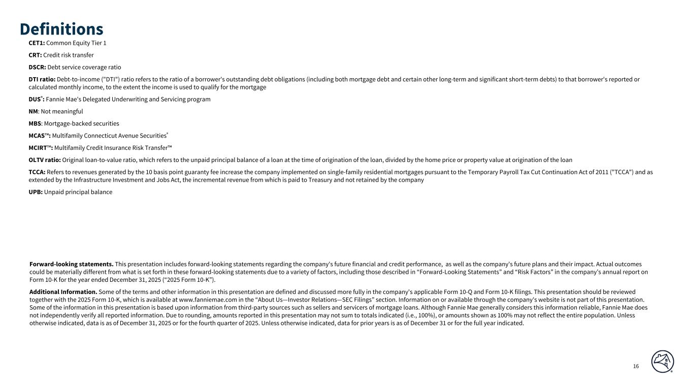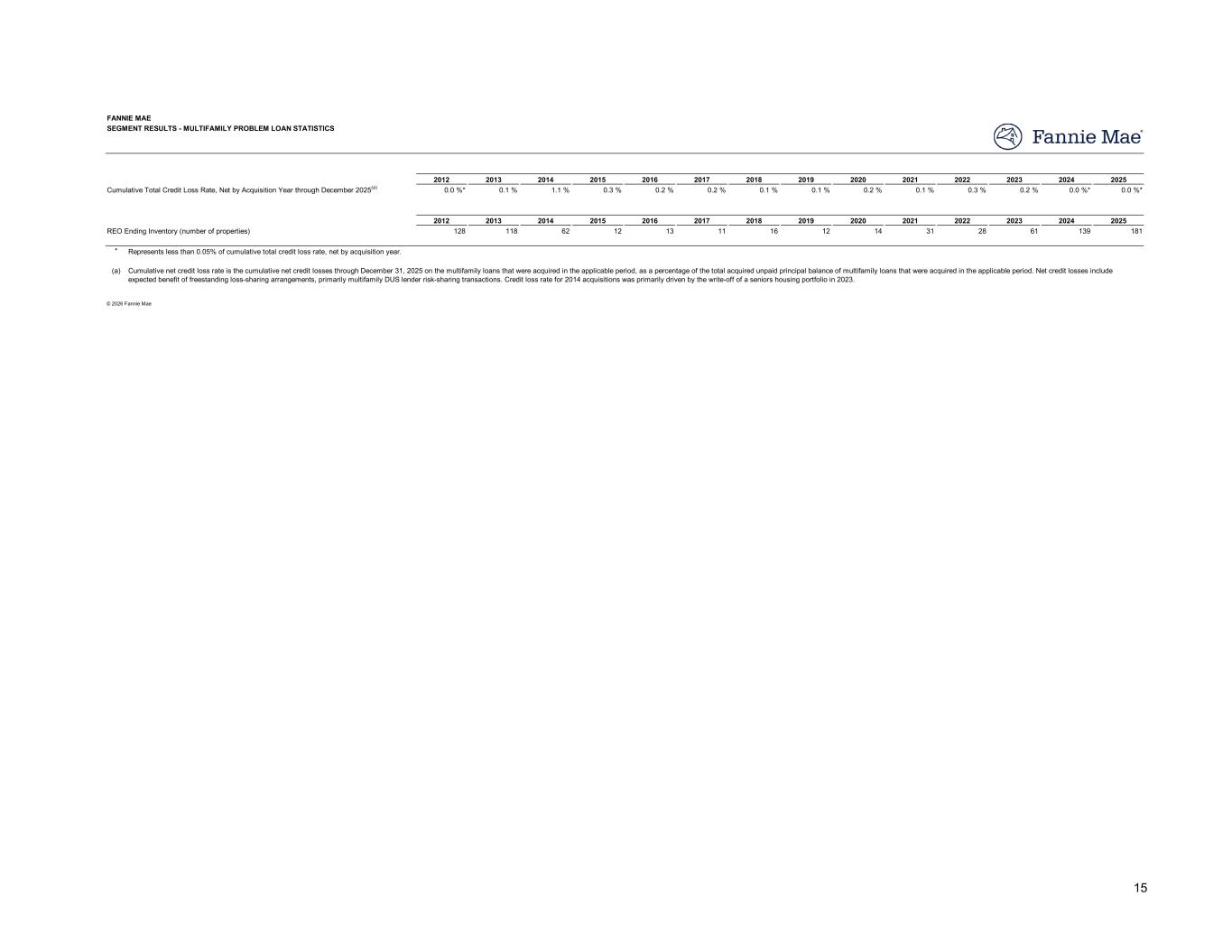 2012 2013 2014 2015 2016 2017 2018 2019 2020 2021 2022 2023 2024 2025 0.0 %* 0.1 % 1.1 % 0.3 % 0.2 % 0.2 % 0.1 % 0.1 % 0.2 % 0.1 % 0.3 % 0.2 % 0.0 %* 0.0 %* 2012 2013 2014 2015 2016 2017 2018 2019 2020 2021 2022 2023 2024 2025 128 118 62 12 13 11 16 12 14 31 28 61 139 181 * Represents less than 0.05% of cumulative total credit loss rate, net by acquisition year. (a) SEGMENT RESULTS - MULTIFAMILY PROBLEM LOAN STATISTICS FANNIE MAE © 2026 Fannie Mae Cumulative net credit loss rate is the cumulative net credit losses through December 31, 2025 on the multifamily loans that were acquired in the applicable period, as a percentage of the total acquired unpaid principal balance of multifamily loans that were acquired in the applicable period. Net credit losses include expected benefit of freestanding loss-sharing arrangements, primarily multifamily DUS lender risk-sharing transactions. Credit loss rate for 2014 acquisitions was primarily driven by the write-off of a seniors housing portfolio in 2023. Cumulative Total Credit Loss Rate, Net by Acquisition Year through December 2025(a) REO Ending Inventory (number of properties) 15