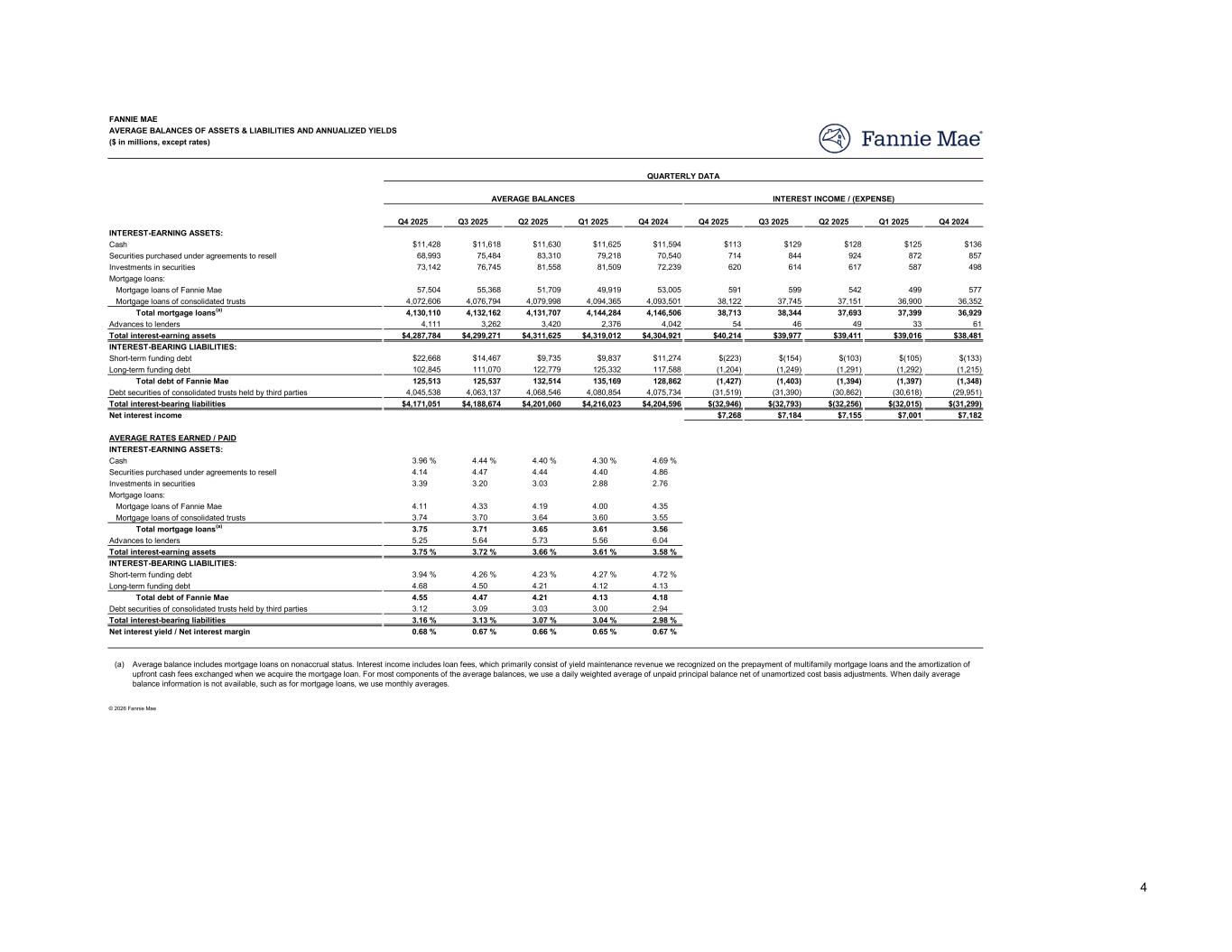 Q4 2025 Q3 2025 Q2 2025 Q1 2025 Q4 2024 Q4 2025 Q3 2025 Q2 2025 Q1 2025 Q4 2024 $11,428 $11,618 $11,630 $11,625 $11,594 $113 $129 $128 $125 $136 68,993 75,484 83,310 79,218 70,540 714 844 924 872 857 73,142 76,745 81,558 81,509 72,239 620 614 617 587 498 57,504 55,368 51,709 49,919 53,005 591 599 542 499 577 4,072,606 4,076,794 4,079,998 4,094,365 4,093,501 38,122 37,745 37,151 36,900 36,352 4,130,110 4,132,162 4,131,707 4,144,284 4,146,506 38,713 38,344 37,693 37,399 36,929 4,111 3,262 3,420 2,376 4,042 54 46 49 33 61 Total interest-earning assets $4,287,784 $4,299,271 $4,311,625 $4,319,012 $4,304,921 $40,214 $39,977 $39,411 $39,016 $38,481 $22,668 $14,467 $9,735 $9,837 $11,274 $(223) $(154) $(103) $(105) $(133) 102,845 111,070 122,779 125,332 117,588 (1,204) (1,249) (1,291) (1,292) (1,215) 125,513 125,537 132,514 135,169 128,862 (1,427) (1,403) (1,394) (1,397) (1,348) 4,045,538 4,063,137 4,068,546 4,080,854 4,075,734 (31,519) (31,390) (30,862) (30,618) (29,951) Total interest-bearing liabilities $4,171,051 $4,188,674 $4,201,060 $4,216,023 $4,204,596 $(32,946) $(32,793) $(32,256) $(32,015) $(31,299) $7,268 $7,184 $7,155 $7,001 $7,182 3.96 % 4.44 % 4.40 % 4.30 % 4.69 % 4.14 4.47 4.44 4.40 4.86 3.39 3.20 3.03 2.88 2.76 4.11 4.33 4.19 4.00 4.35 3.74 3.70 3.64 3.60 3.55 3.75 3.71 3.65 3.61 3.56 5.25 5.64 5.73 5.56 6.04 Total interest-earning assets 3.75 % 3.72 % 3.66 % 3.61 % 3.58 % 3.94 % 4.26 % 4.23 % 4.27 % 4.72 % 4.68 4.50 4.21 4.12 4.13 4.55 4.47 4.21 4.13 4.18 3.12 3.09 3.03 3.00 2.94 Total interest-bearing liabilities 3.16 % 3.13 % 3.07 % 3.04 % 2.98 % 0.68 % 0.67 % 0.66 % 0.65 % 0.67 % (a) FANNIE MAE AVERAGE BALANCES OF ASSETS & LIABILITIES AND ANNUALIZED YIELDS ($ in millions, except rates) QUARTERLY DATA AVERAGE BALANCES Cash Investments in securities Securities purchased under agreements to resell Mortgage loans of Fannie Mae Mortgage loans: AVERAGE RATES EARNED / PAID Cash INTEREST-EARNING ASSETS: INTEREST INCOME / (EXPENSE) Investments in securities Securities purchased under agreements to resell Long-term funding debt Debt securities of consolidated trusts held by third parties Total debt of Fannie Mae Net interest income Mortgage loans of consolidated trusts Total mortgage loans(a) Advances to lenders Short-term funding debt INTEREST-BEARING LIABILITIES: INTEREST-EARNING ASSETS: Mortgage loans: Mortgage loans of Fannie Mae Total mortgage loans(a) Mortgage loans of consolidated trusts Advances to lenders Net interest yield / Net interest margin © 2026 Fannie Mae Average balance includes mortgage loans on nonaccrual status. Interest income includes loan fees, which primarily consist of yield maintenance revenue we recognized on the prepayment of multifamily mortgage loans and the amortization of upfront cash fees exchanged when we acquire the mortgage loan. For most components of the average balances, we use a daily weighted average of unpaid principal balance net of unamortized cost basis adjustments. When daily average balance information is not available, such as for mortgage loans, we use monthly averages. INTEREST-BEARING LIABILITIES: Short-term funding debt Long-term funding debt Debt securities of consolidated trusts held by third parties Total debt of Fannie Mae 4