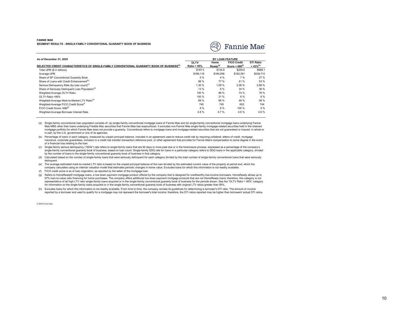 2025 2024 2023 2022 2020 - 2021 2019 - 2009 2008 & Earlier Overall Book / Total $290.6 $270.5 $223.6 $415.2 $1,657.5 $663.6 $48.3 $3,569.3 $332,210 $313,173 $297,045 $277,663 $235,844 $126,175 $71,615 $210,595 8 % 8 % 6 % 12 % 46 % 19 % 1 % 100 % 38 % 71 % 78 % 65 % 41 % 35 % 8 % 47 % 0.12 % 0.50 % 0.82 % 0.98 % 0.39 % 0.62 % 1.71 % 0.58 % 1 % 5 % 6 % 15 % 28 % 33 % 12 % 100 % 77 % 78 % 79 % 76 % 70 % 75 % 75 % 74 % 6 % 8 % 7 % 6 % 3 % 8 % 9 % 5 % 76 % 74 % 71 % 64 % 46 % 31 % 27 % 51 % 756 757 755 747 758 746 694 753 7 % 5 % 5 % 8 % 5 % 11 % 39 % 7 % 6.5 % 6.6 % 6.6 % 4.7 % 3.0 % 4.1 % 5.5 % 4.2 % Q4 2025 2024 2023 2022 2021 51 % 50 % 51 % 52 % 54 % 753 753 753 752 753 (a) (b) (c) (d) (e) (f) (g) FANNIE MAE SEGMENT RESULTS - SINGLE-FAMILY CONVENTIONAL GUARANTY BOOK OF BUSINESS As of December 31, 2025 SELECTED CREDIT CHARACTERISTICS OF SINGLE-FAMILY CONVENTIONAL GUARANTY BOOK OF BUSINESS(a)(b) Average UPB Total UPB ($ in billions) BY ORIGINATION YEAR Share of Loans with Credit Enhancement(c) Share of SF Conventional Guaranty Book Serious Delinquency Rate (by loan count)(d) Share of Seriously Delinquent Loan Population(e) OLTV Ratio >95% Weighted-Average OLTV Ratio Weighted-Average FICO Credit Score(g) Weighted-Average Mark-to-Market LTV Ratio(f) FICO Credit Score <680(g) Weighted-Average Borrower Interest Rate Single-Family Conventional Guaranty Book of Business Credit Characteristics Weighted-Average FICO Credit Score(g) Single-Family Weighted-Average Mark-to-Market Loan-to-Value Ratio Single-family conventional loan population consists of: (a) single-family conventional mortgage loans of Fannie Mae and (b) single-family conventional mortgage loans underlying Fannie Mae MBS other than loans underlying Freddie Mac securities that Fannie Mae has resecuritized. It excludes non-Fannie Mae single-family mortgage-related securities held in the retained mortgage portfolio for which Fannie Mae does not provide a guaranty. Conventional refers to mortgage loans and mortgage-related securities that are not guaranteed or insured, in whole or in part, by the U.S. government or one of its agencies. Calculated based on the aggregate unpaid principal balance of single-family loans for each category divided by the aggregate unpaid principal balance of loans in the single-family conventional guaranty book of business. Loans with multiple product features are included in all applicable categories. Percentage of loans in each category, measured by unpaid principal balance, included in an agreement used to reduce credit risk by requiring collateral, letters of credit, mortgage insurance, corporate guarantees, inclusion in a credit risk transfer transaction reference pool, or other agreement that provides for Fannie Mae's compensation to some degree in the event of a financial loss relating to the loan. Single-family serious delinquency (“SDQ”) rate refers to single-family loans that are 90 days or more past due or in the foreclosure process, expressed as a percentage of the company’s single-family conventional guaranty book of business, based on loan count. Single-family SDQ rate for loans in a particular category refers to SDQ loans in the applicable category, divided by the number of loans in the single-family conventional guaranty book of business in that category. FICO credit score is as of loan origination, as reported by the seller of the mortgage loan. The average estimated mark-to-market LTV ratio is based on the unpaid principal balance of the loan divided by the estimated current value of the property at period end, which the company calculates using an internal valuation model that estimates periodic changes in home value. Excludes loans for which this information is not readily available. Calculated based on the number of single-family loans that were seriously delinquent for each category divided by the total number of single-family conventional loans that were seriously delinquent. © 2026 Fannie Mae 9
