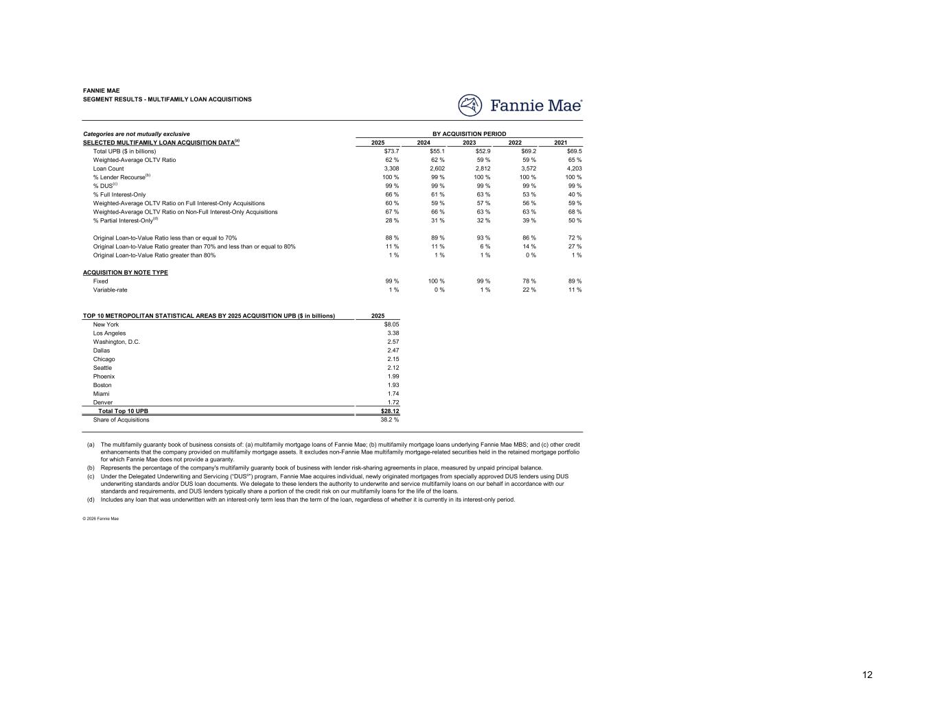 2025 2024 2023 2022 2021 $73.7 $55.1 $52.9 $69.2 $69.5 62 % 62 % 59 % 59 % 65 % 3,308 2,602 2,812 3,572 4,203 100 % 99 % 100 % 100 % 100 % 99 % 99 % 99 % 99 % 99 % 66 % 61 % 63 % 53 % 40 % 60 % 59 % 57 % 56 % 59 % 67 % 66 % 63 % 63 % 68 % 28 % 31 % 32 % 39 % 50 % 88 % 89 % 93 % 86 % 72 % 11 % 11 % 6 % 14 % 27 % 1 % 1 % 1 % 0 % 1 % 99 % 100 % 99 % 78 % 89 % 1 % 0 % 1 % 22 % 11 % 2025 $8.05 3.38 2.57 2.47 2.15 2.12 1.99 1.93 1.74 1.72 $28.12 38.2 % (a) (b) (c) (d) SEGMENT RESULTS - MULTIFAMILY LOAN ACQUISITIONS FANNIE MAE Categories are not mutually exclusive SELECTED MULTIFAMILY LOAN ACQUISITION DATA(a) Weighted-Average OLTV Ratio Total UPB ($ in billions) BY ACQUISITION PERIOD % Lender Recourse(b) Loan Count % DUS(c) % Full Interest-Only Weighted-Average OLTV Ratio on Non-Full Interest-Only Acquisitions Weighted-Average OLTV Ratio on Full Interest-Only Acquisitions % Partial Interest-Only(d) Original Loan-to-Value Ratio less than or equal to 70% Original Loan-to-Value Ratio greater than 70% and less than or equal to 80% Original Loan-to-Value Ratio greater than 80% Fixed ACQUISITION BY NOTE TYPE Variable-rate TOP 10 METROPOLITAN STATISTICAL AREAS BY 2025 ACQUISITION UPB ($ in billions) Los Angeles New York Washington, D.C. Dallas Seattle Chicago Boston Phoenix Miami Denver Share of Acquisitions Total Top 10 UPB Includes any loan that was underwritten with an interest-only term less than the term of the loan, regardless of whether it is currently in its interest-only period. © 2026 Fannie Mae The multifamily guaranty book of business consists of: (a) multifamily mortgage loans of Fannie Mae; (b) multifamily mortgage loans underlying Fannie Mae MBS; and (c) other credit enhancements that the company provided on multifamily mortgage assets. It excludes non-Fannie Mae multifamily mortgage-related securities held in the retained mortgage portfolio for which Fannie Mae does not provide a guaranty. Represents the percentage of the company's multifamily guaranty book of business with lender risk-sharing agreements in place, measured by unpaid principal balance. Under the Delegated Underwriting and Servicing (“DUS®”) program, Fannie Mae acquires individual, newly originated mortgages from specially approved DUS lenders using DUS underwriting standards and/or DUS loan documents. We delegate to these lenders the authority to underwrite and service multifamily loans on our behalf in accordance with our standards and requirements, and DUS lenders typically share a portion of the credit risk on our multifamily loans for the life of the loans. 12